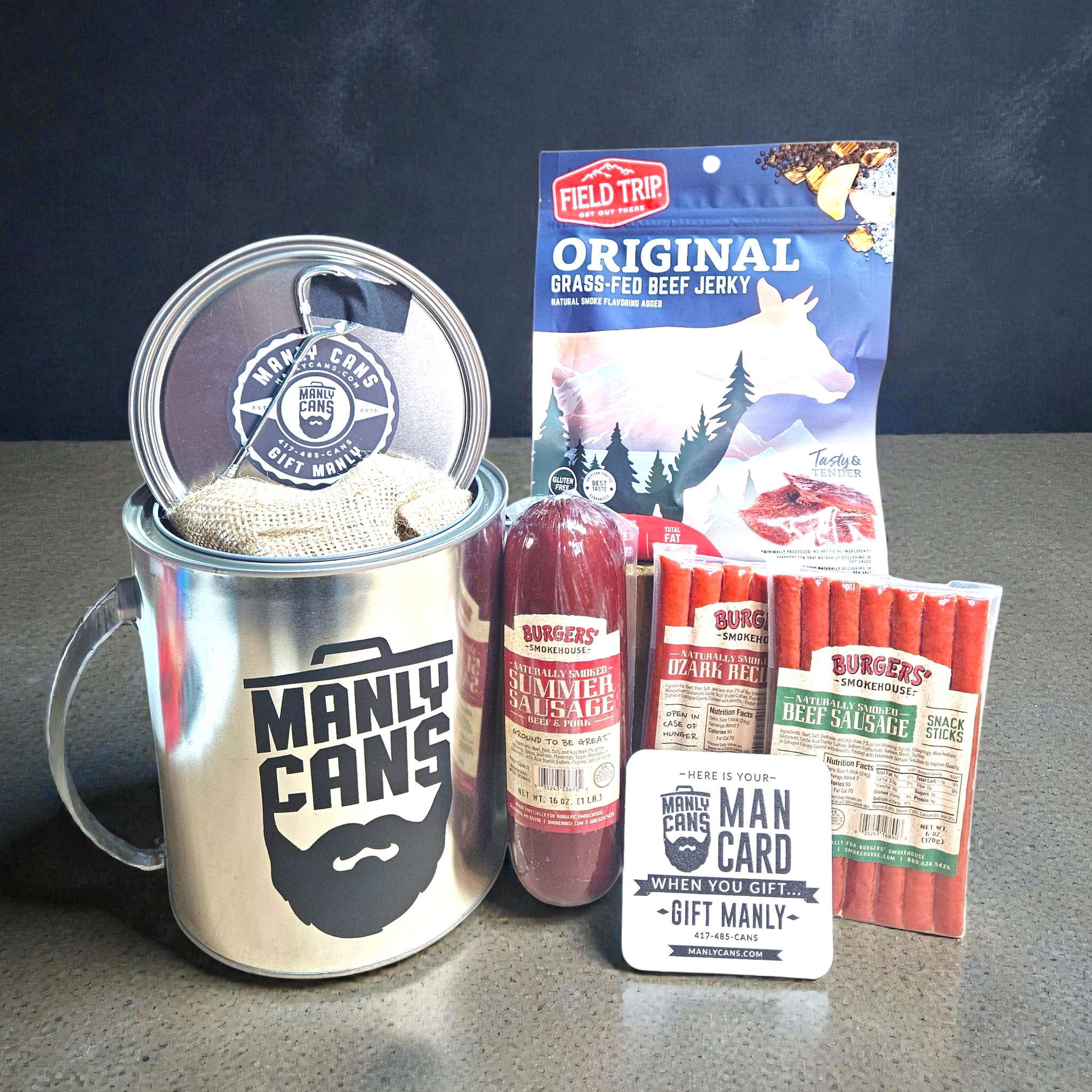 The Small CANivore Manly Can is perfect for the carnivorous man in your life. Field Trip's Grass Fed, thoroughly marinated original beef jerky pairs well with Burgers' 1 lb. Sausage and Burgers' Pork and Beef sticks for the perfect combination of salty, meaty snacks.