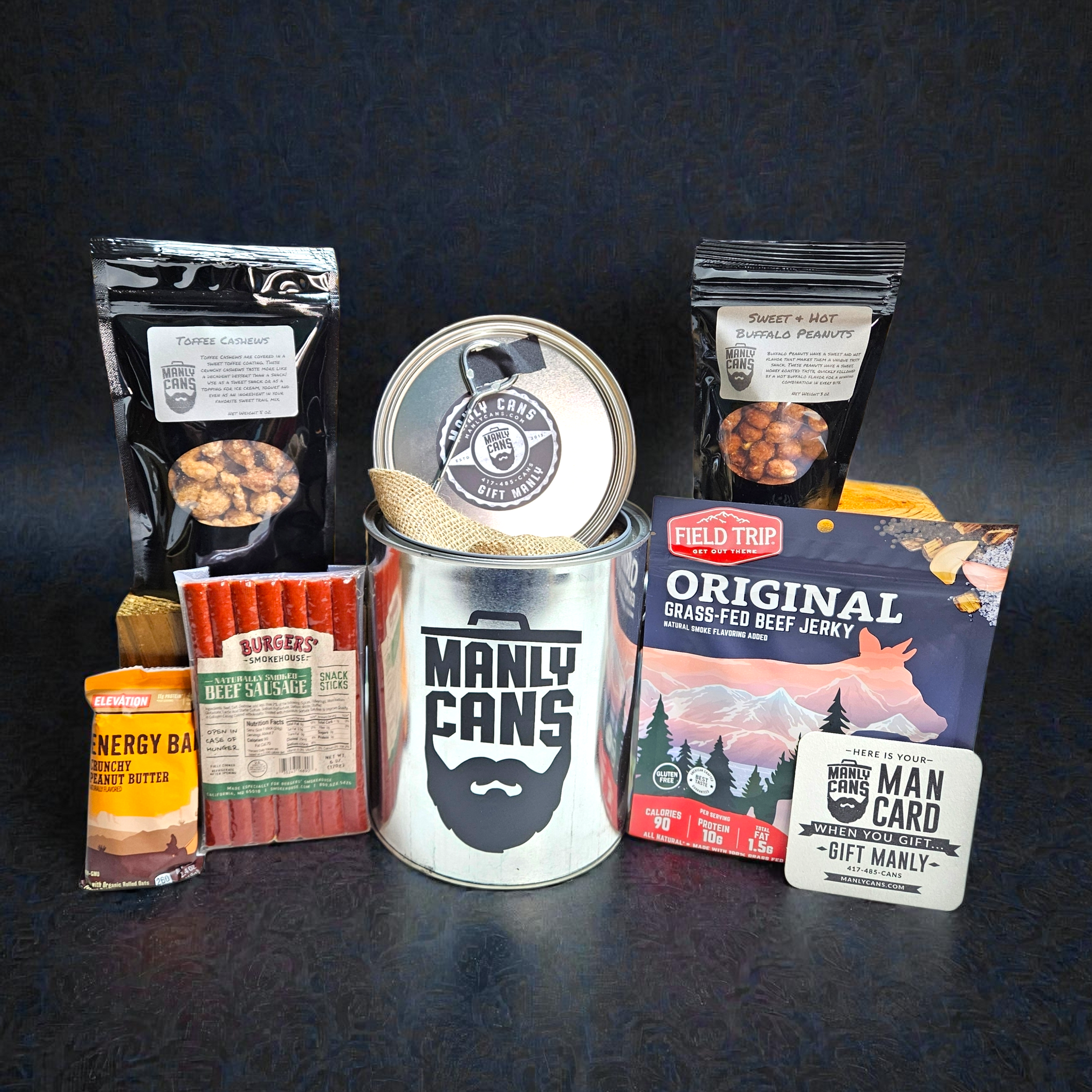 Bulk up, man up, and feel the muscle with our Protein Can. Perfect for outdoor adventures, workout energy, or a survive-the-afternoon pick me up, this can is packed with an amazing assortment of high protein snacks. Fulfill your hunger with Field Trip Original Beef Jerky, Burger’s Smokehouse Beef Sticks, Manly Cans Sweet Buffalo Peanuts and Toffee Cashews, and a Peanut Butter protein bar to top it off.