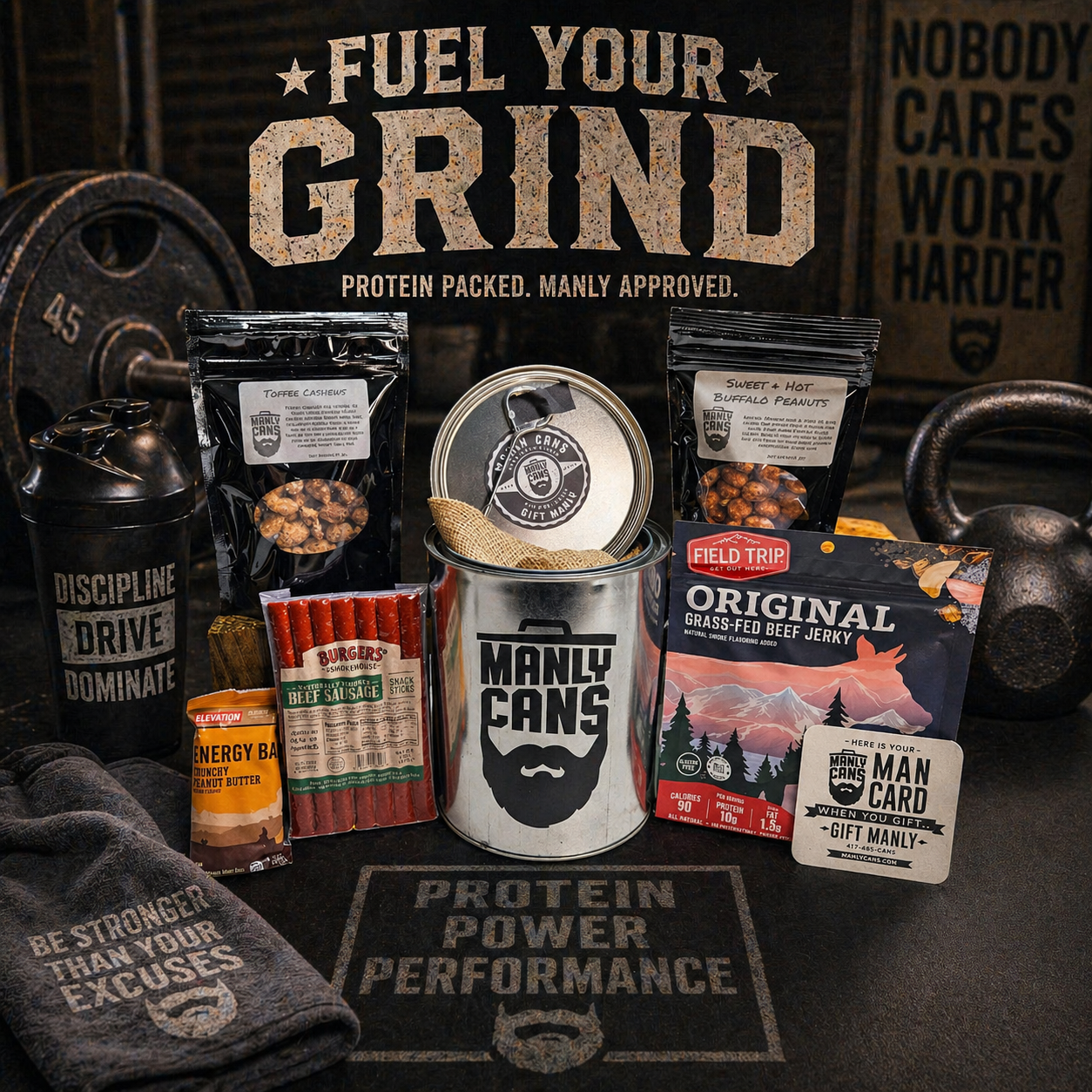 Bulk up, man up, and feel the muscle with our Protein Can. Perfect for outdoor adventures, workout energy, or a survive-the-afternoon pick me up, this can is packed with an amazing assortment of high protein snacks. Fulfill your hunger with Field Trip Original Beef Jerky, Burger’s Smokehouse Beef Sticks, Manly Cans Sweet Buffalo Peanuts and Toffee Cashews, and a Peanut Butter protein bar to top it off.